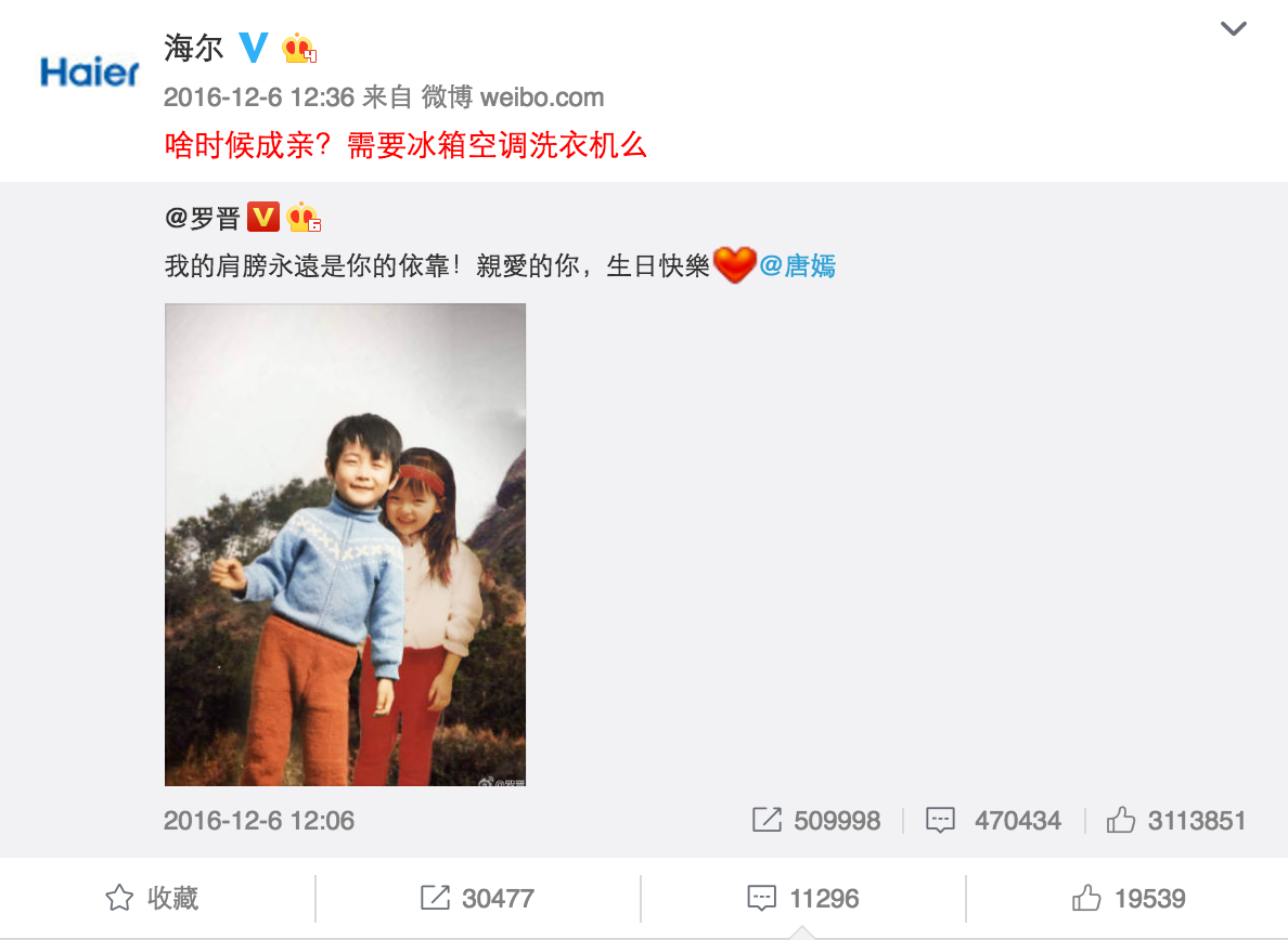 說到海爾,大家的第一印象大多都是搶熱門。比如唐嫣羅晉公布戀情時(shí),海爾官微借勢(shì)發(fā)布微博"啥時(shí)候成親?需要冰箱空調(diào)洗衣機(jī)么"成功帶領(lǐng)了一眾藍(lán)V搞事情,因?yàn)檫@個(gè)句式很容易被模仿,所以藍(lán)V的參與度非常高。