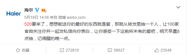 520表白日,海爾搞了一個(gè)事情,聯(lián)合60多家藍(lán)V,給一位幸運(yùn)粉絲送禮物。這條轉(zhuǎn)發(fā)評(píng)論送禮物的微博在半個(gè)小時(shí)之內(nèi)就轉(zhuǎn)發(fā)過萬。