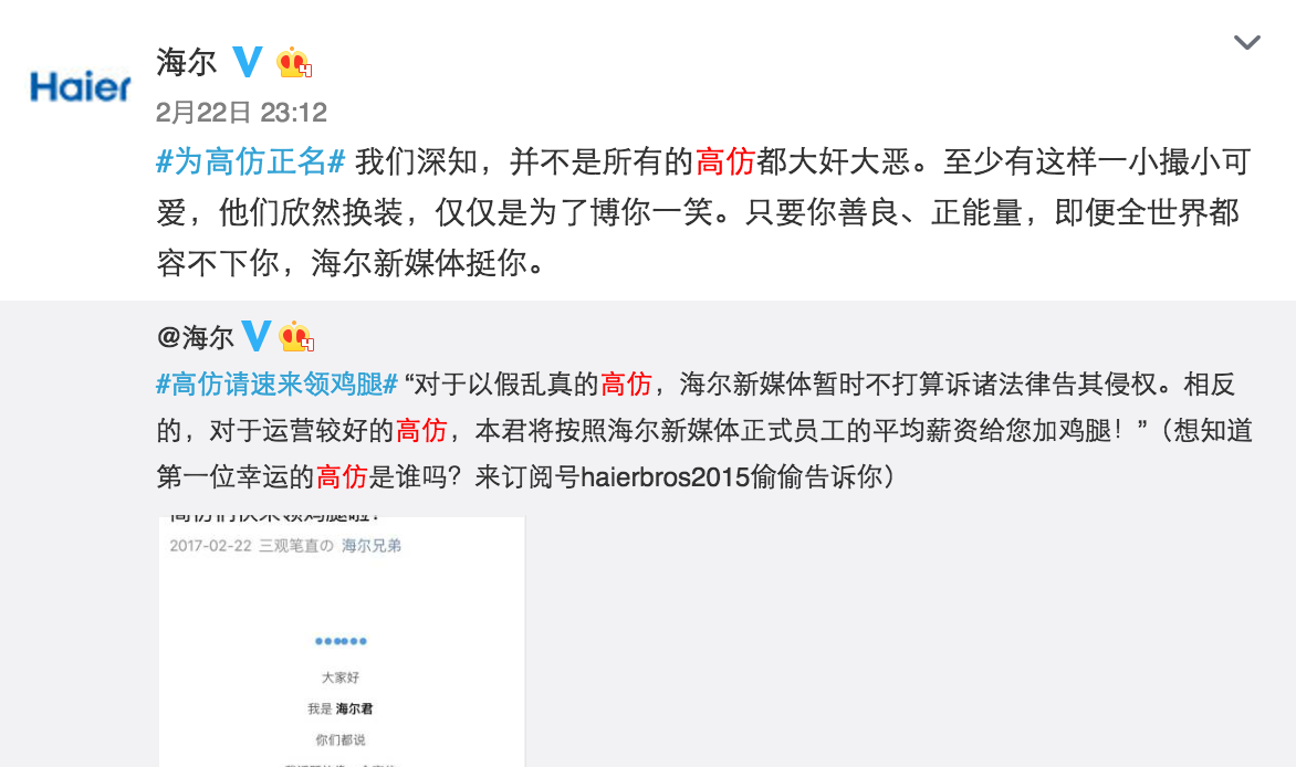 不知道從什么時(shí)候開始,平時(shí)刷微博時(shí)你會(huì)發(fā)現(xiàn)很多的高仿號(hào),潛伏于各大評(píng)論中真假難辨。@海爾作為藍(lán)V總教頭,也遇見過很多海爾的高仿號(hào),后來發(fā)現(xiàn),其實(shí)這些高仿號(hào)是海爾的年輕用戶,他們想搶熱門,跟你的粉絲有效互動(dòng)。面對(duì)這么一批可愛的小粉絲,@海爾沒有封殺,而是做官方聲明,只要你善良,且正能量,哪怕全世界都不管你我們呼喚你,甚至還給高仿號(hào)發(fā)福利。
